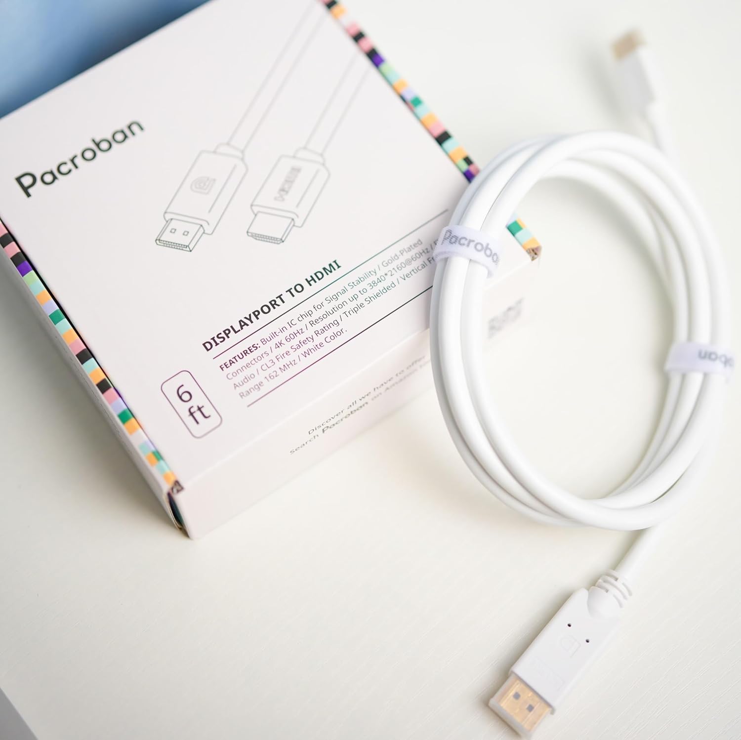 Pacroban DisplayPort to HDMI Cable White – Bulk Pack (6ft, 10ft) | 4K 60Hz, CL3 In-Wall Rated | DP (Source) to HDMI (Display) Wholesale