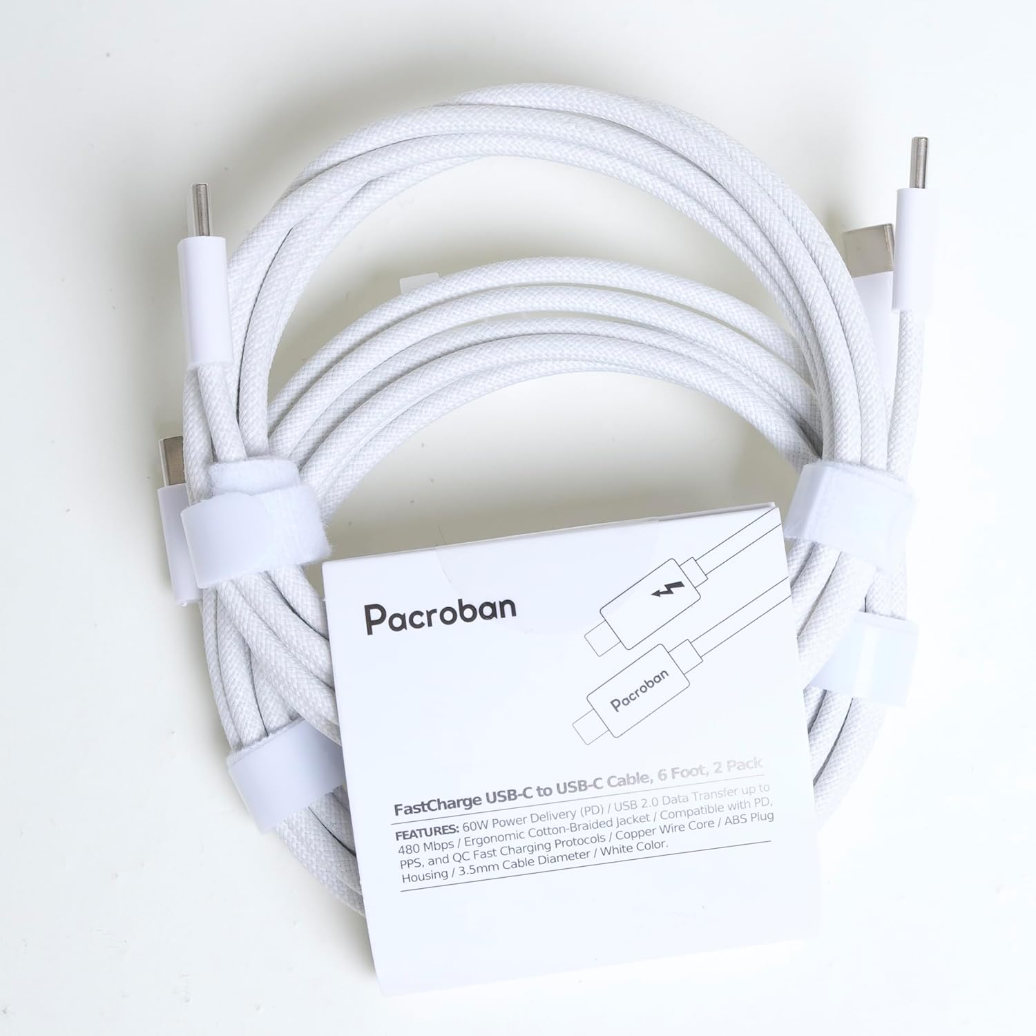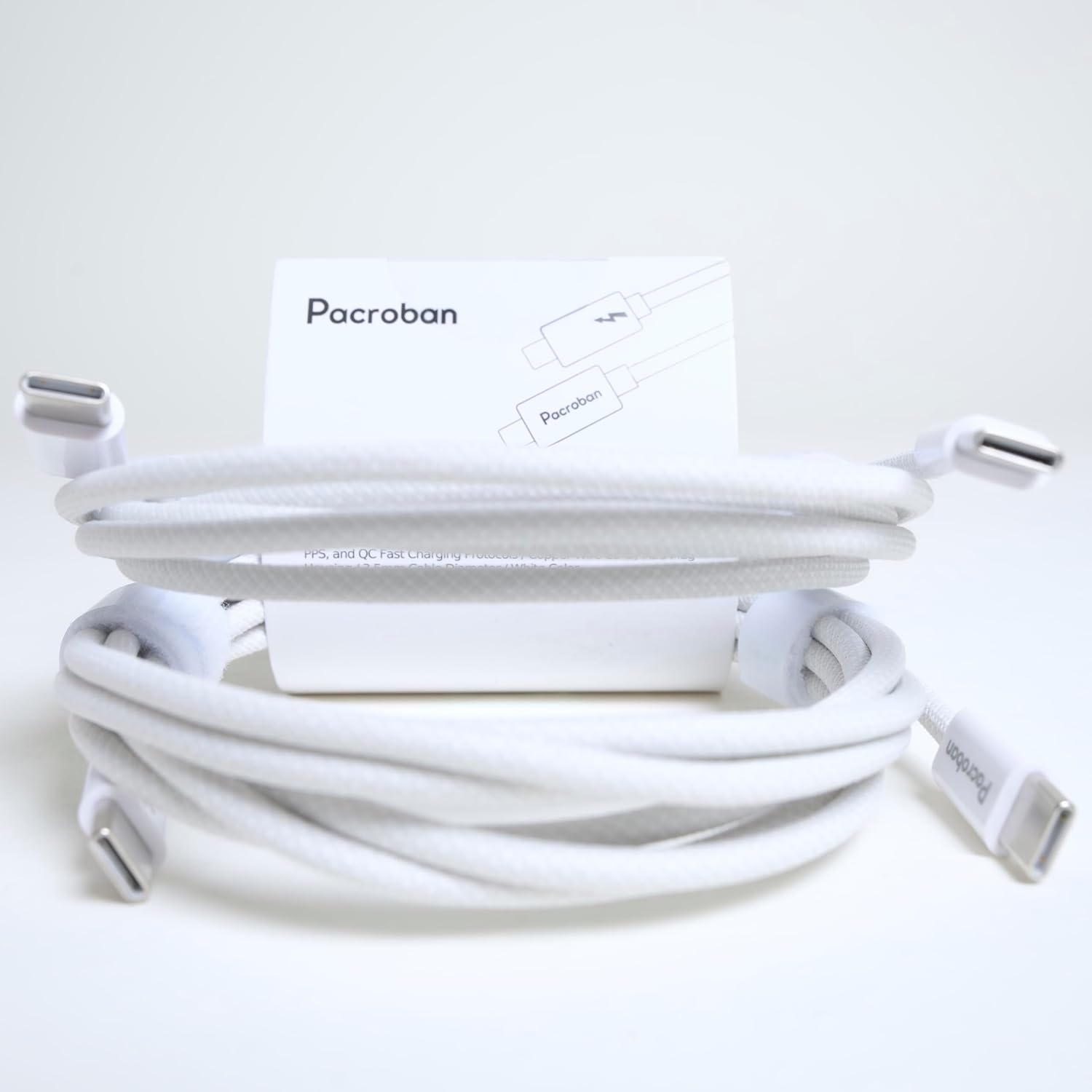 The Pacroban USB-C to USB-C Cable (White, 2-Pack) is designed for fast charging and reliable data transfer across modern USB-C devices.
